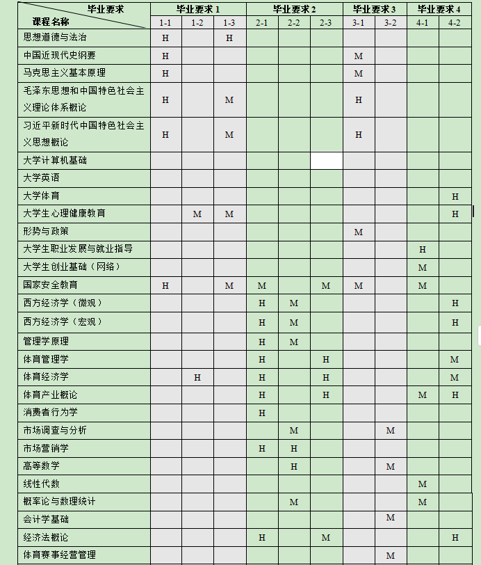 目标5(持续发展能力):具备自主学习、持续学习和适应变化的能力,具备终身学习意识、公平竞争意识、环境保护意识和开拓创新精神,关注和学习最新的体育经济和管理理论、技术、工具等,不断提升自己的专业素养和实践能力,适应行业发展的变化和需求。
