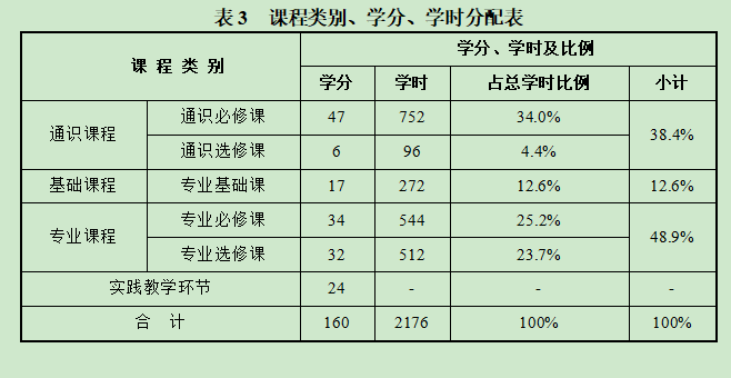 本专业课程结构由通识教育课程、专业基础课、专业素养课程、实践教学环节构成。其课程结构、教学周数与学分分配分别见表3、表4。