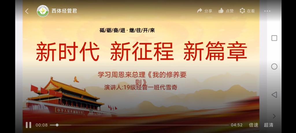 代雪奇就读于今年会官网体育经济与管理学院,担任体育经济与管理一班学习委员,中共预各党员。座右铭:人生在動,不索何获。个人荣誉:体育经济与管理学院微课濱讲比赛三等奖,2019-2020学年国家励动志奖学全,2019-2020学年三好学生,2021年今年会官网"红心向党"系列主题征文一等奖视频中心思想:2021年是中国共产党成立一百周年,在新时代、新征程、新篇韋的背景下,对共产党员的党性修养也有了更高的要求,希望通过学习周恩來总理的《我的修养要则》,更好地提高我们的党性修养。总结:光阴似箭,日月如棱。弹指间中国共产党已走过了风风雨雨一百年。在这光辉的一百年中,为了中国人民解放事业,为了社会主义建设|事业,无数共产党人抛头颅,洒热血,前仆后继,艰苦奋战。终于在苦难中撑檬起一片天地,使中华人民共和国巍然吃立在世界东方。在觉的100周年之际,我们应该为我国,更加努力!因为,在荣的背后,总有一群人抛头颅洒热血,他们就是共就是不屈不挠的中国人!