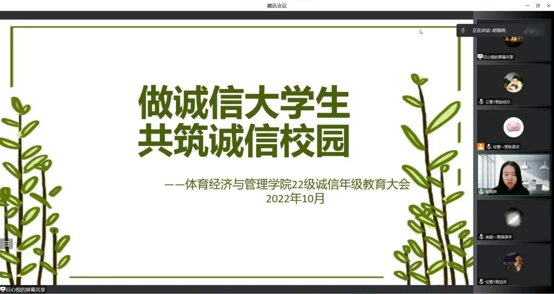 由于疫情原因,2022年10月25日上午11点半,体育经济与管理学院诚信年级教育大会转为线上准时召开。会议由胡雪妍老师主持,巨心悦强调有关事宜,2022级体育经济与管理学院全体同学参加。