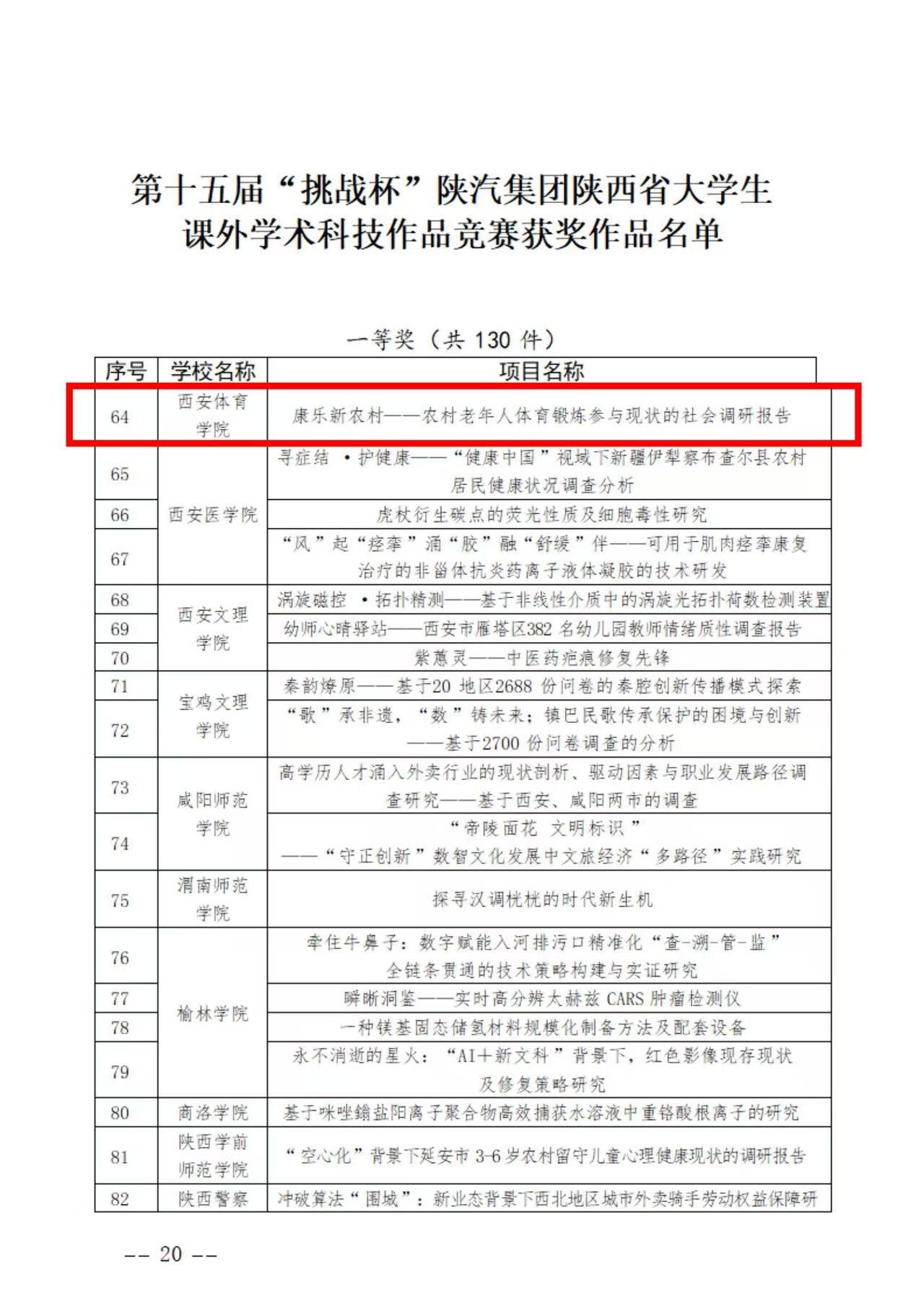 近日,由共青团陕西省委等多部门联合主办,西安工业大学承办的第十五届“挑战杯”陕汽集团陕西省大学生课外学术科技作品竞赛圆满落幕。体育经济与管理学院积极响应大赛号召,组织学生踊跃参赛,在本次竞赛中取得优异成绩。