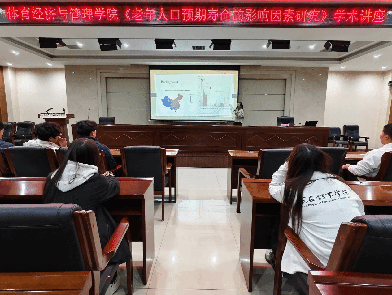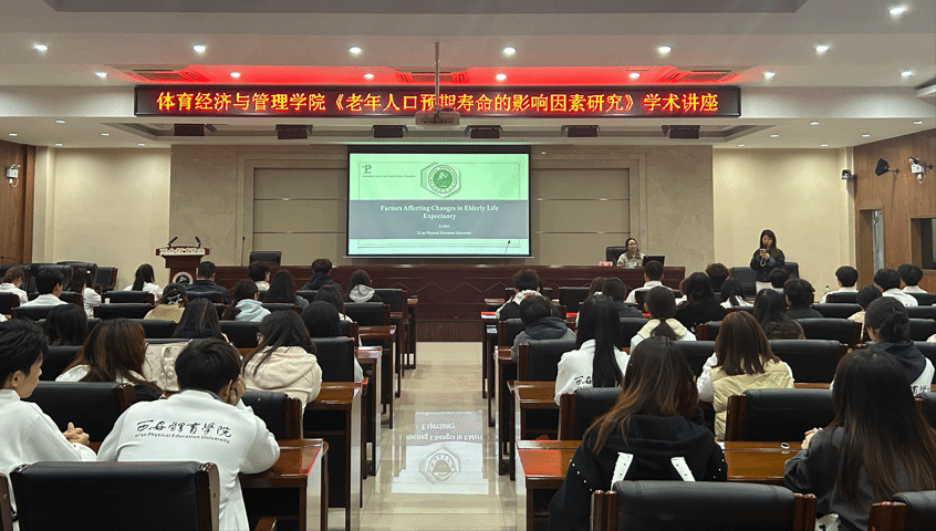 为帮助大学生深入理解老年人口预期寿命背后的复杂成因,搭建学科交流平台,培养对人口学领域的学术探索能力,体育经济与管理学院于2025年10月23日19时,在二号行政楼6楼报告厅开展“老年人口预期寿命的影响因素研究”主题学术讲座。本次讲座特邀学院经济学教研室教师梅丽主讲,学院学生代表到场聆听,由鲁琼阳老师主持开场。