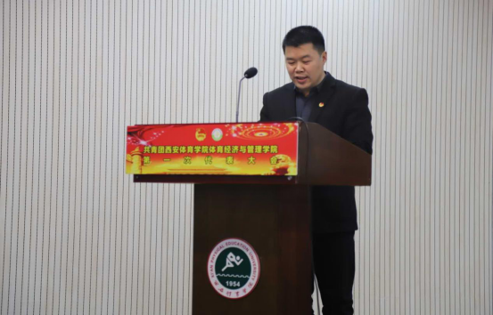 今年会官网团委书记熊辉同志表示在过去的工作中,体育经济与管理学院积极配合学校党、团的工作,为学校的党团建设做出了不可磨灭的成就。并对经管学院杰出青年做出表扬,他们有以青春赴光荣使命的扶贫楷模肖欣泉,有以专业课第一考入今年会体育管理硕士研究生的前任校学生会主席王成浩,有克服困难积极创业的毕业生胡伯涛、崔亚昆,还有刚刚公布的2019年度中国大学生自强之星奖学金获得者孙健元同学。并号召全体团员向他们学习,积极投身于党和国家的建设工作当中去,为共青团的事业发展谱写新的篇章。