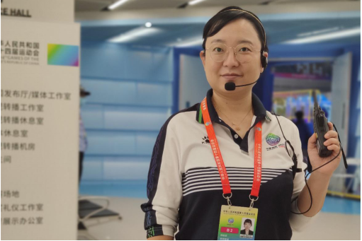 郭轶群老师在体操竞委会负责颁奖礼仪工作,为体操颁奖环节顺利进行贡献一份力量。