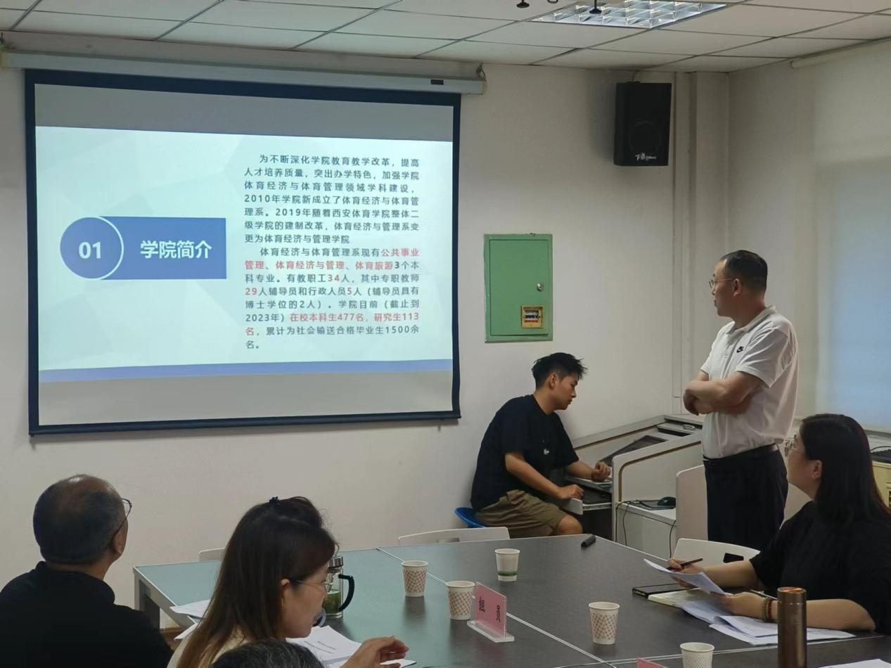 其次,王鹏院长作为主要汇报人就此次体育经济与管理学院的评估材料以PPT形式对学校审核评估专家小组进行汇报。评估组专家成员针对评估材料出现的问题进行提问,并提出合理化建议。其中,评估组成员刘耀荣对此次经管学院审核评估工作提出如下要求:一要通过评估工作进一步梳理、凝练、明确人才培养理念,加强加强教学资源条件建设,形成办学特色;二要针对自评中发现的问题,明确任务及下一步整改举措;三是加强学院评估报告文字描述,支撑数据应简练准确,客观反映学院办学情况。