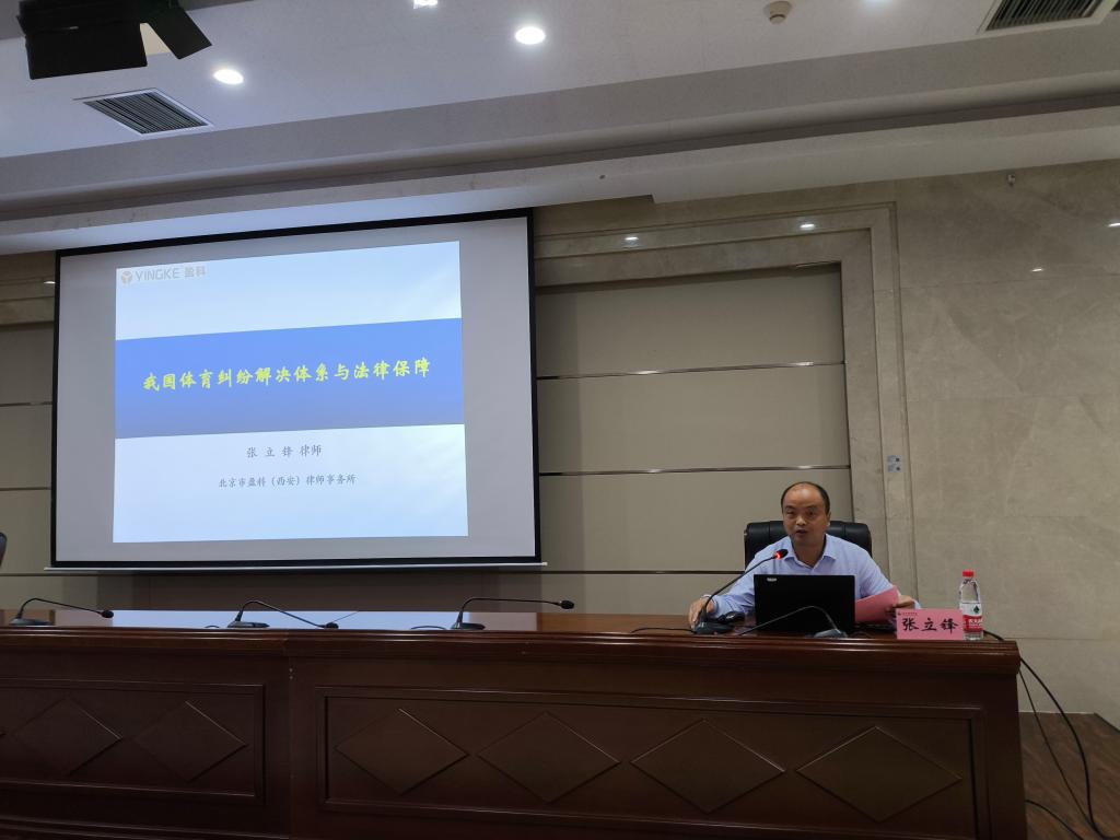 第二场主题报告由北京市盈科(西安)律师事务所创始合伙人张立锋律师主讲,题为“体育纠纷解决体系与法律保障”,张律师从概念、解决现状和解决体系三个方面,深入剖析了我国体育纠纷问题的现状,并通过热点问题和自身所解决的案例,生动展示了我国体育纠纷解决体系所存在的不足。在互动环节,张恩利副院长以即将举办的15届全运会为例,向张律师提问薪资纠纷的解决方式, 张律师给出了专业的解答。