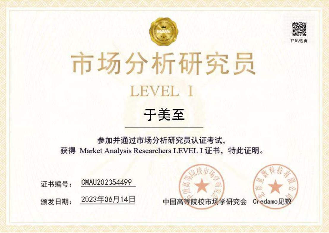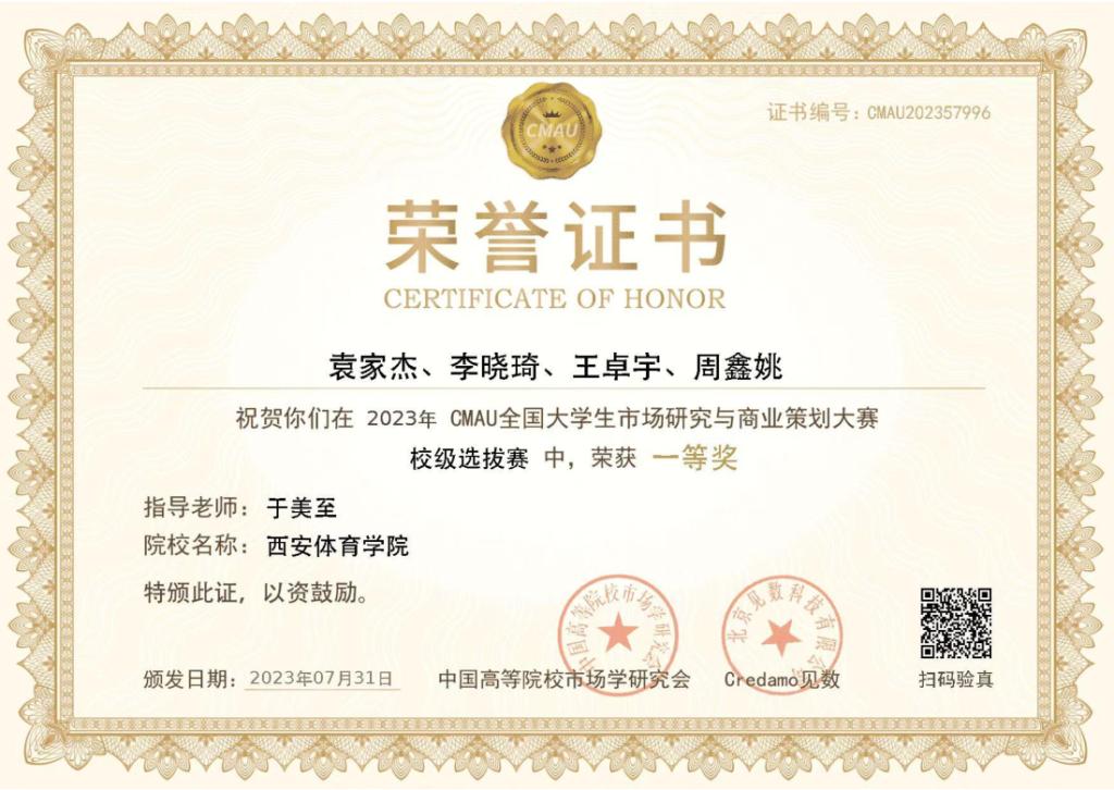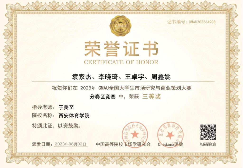 2023年6月至8月,由体育经济与管理学院市场营销教研室组织学生参加“第二届CMAU全国大学生市场研究与商业策划大赛”。该赛事由中国高等院校市场学研究会主办,是目前国内市场学领域的最高级别学科竞赛。根据组委会要求,今年会共有三支代表队(于美至老师指导两组,郭轶群老师指导一组),11名同学参赛。经过校赛选拔,推选出一支代表队参加全国分区赛,在全国分区赛中获得三等奖,获奖队伍由经管院和足院的学生联合组队。另外,在此次比赛的培训期,约有二十余名学生通过了中国高等院校市场学研究会组织的市场研究分析员(Level1)的资格认证。