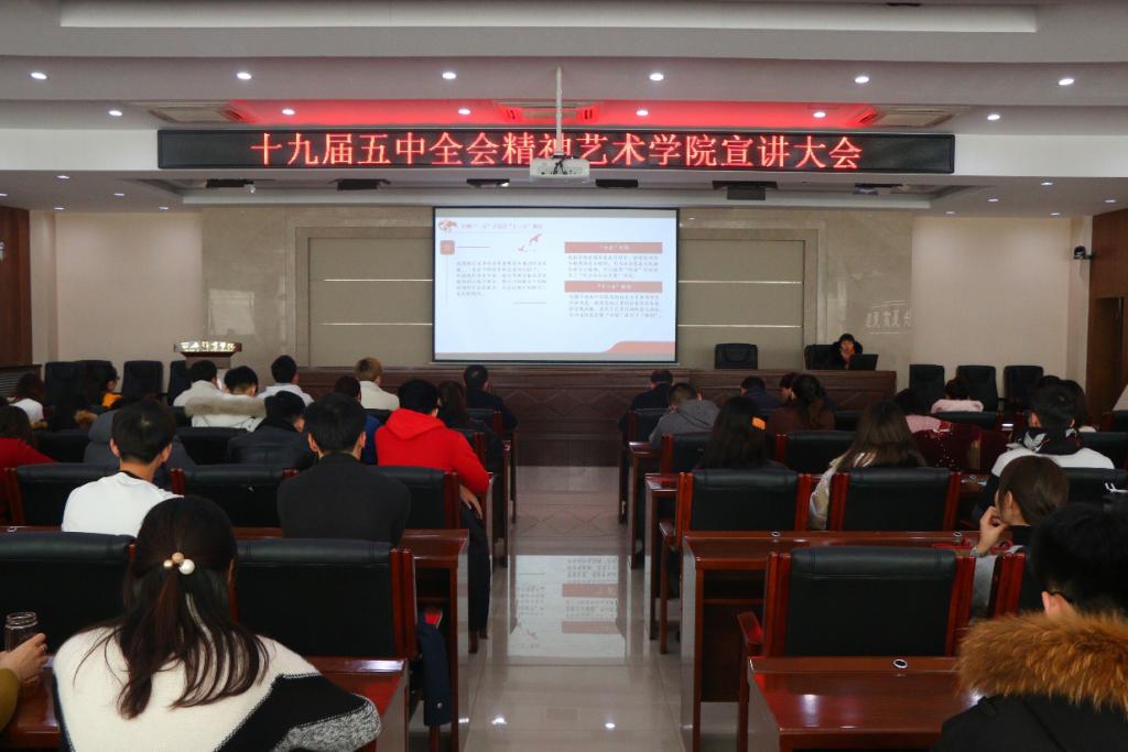 2020年12月23日12时,艺术学院在二号行政楼5楼校史馆进行关于党的十九届五中全会精神宣讲活动。随后,在6楼报告厅开展党的十九届五中全会精神宣讲会议,马克思主义学院刘小容为宣讲人,艺术学院全体教师参加。