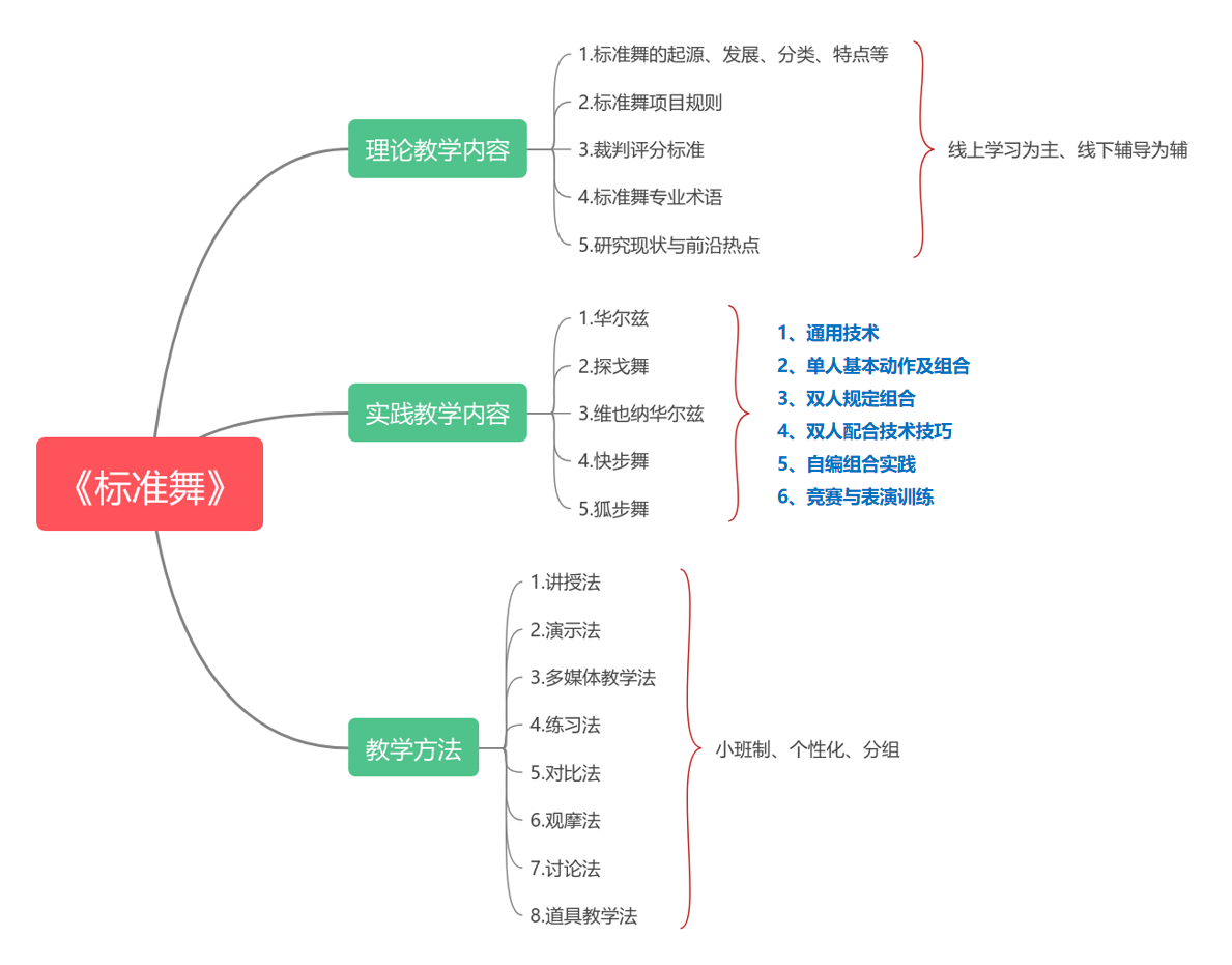1)美育功能:标准舞是融舞蹈、音乐、体育于一体的运动项目,综合性和艺术性较强,具有丰富的美学内容。本课程通过线上资源直观展示、课堂教学切身体会多维度丰富学生的审美体验,发挥美育价值。