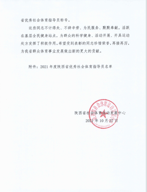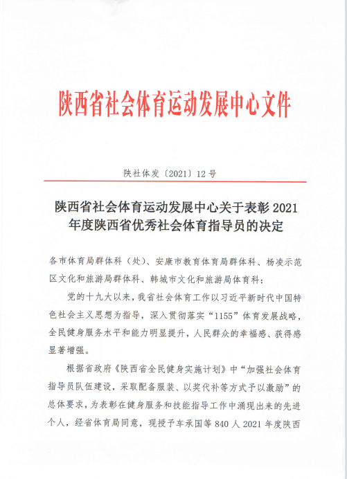 操舞教研室匡小红老师、王硕老师,在陕西省社会体育指导工作中,不计得失、默默奉献、为民服务,为群众的科学健身、活动开展、开具运动处方发挥了积极作用,两位教师作为省级有关单位代表被授予“2021年度陕西省优秀社会体育指导员”称号。