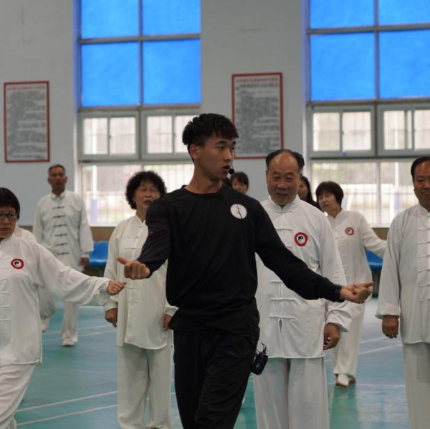 艺术学院舞蹈表演专业20级学生、艺术学院学生会团委组织部部长、健美操国家一级裁判员、广场舞国家一级教练员及裁判员、陕西省广场舞协会操舞专委会委员张宸恺作为省派健身教练为群众进行健身技能辅导。