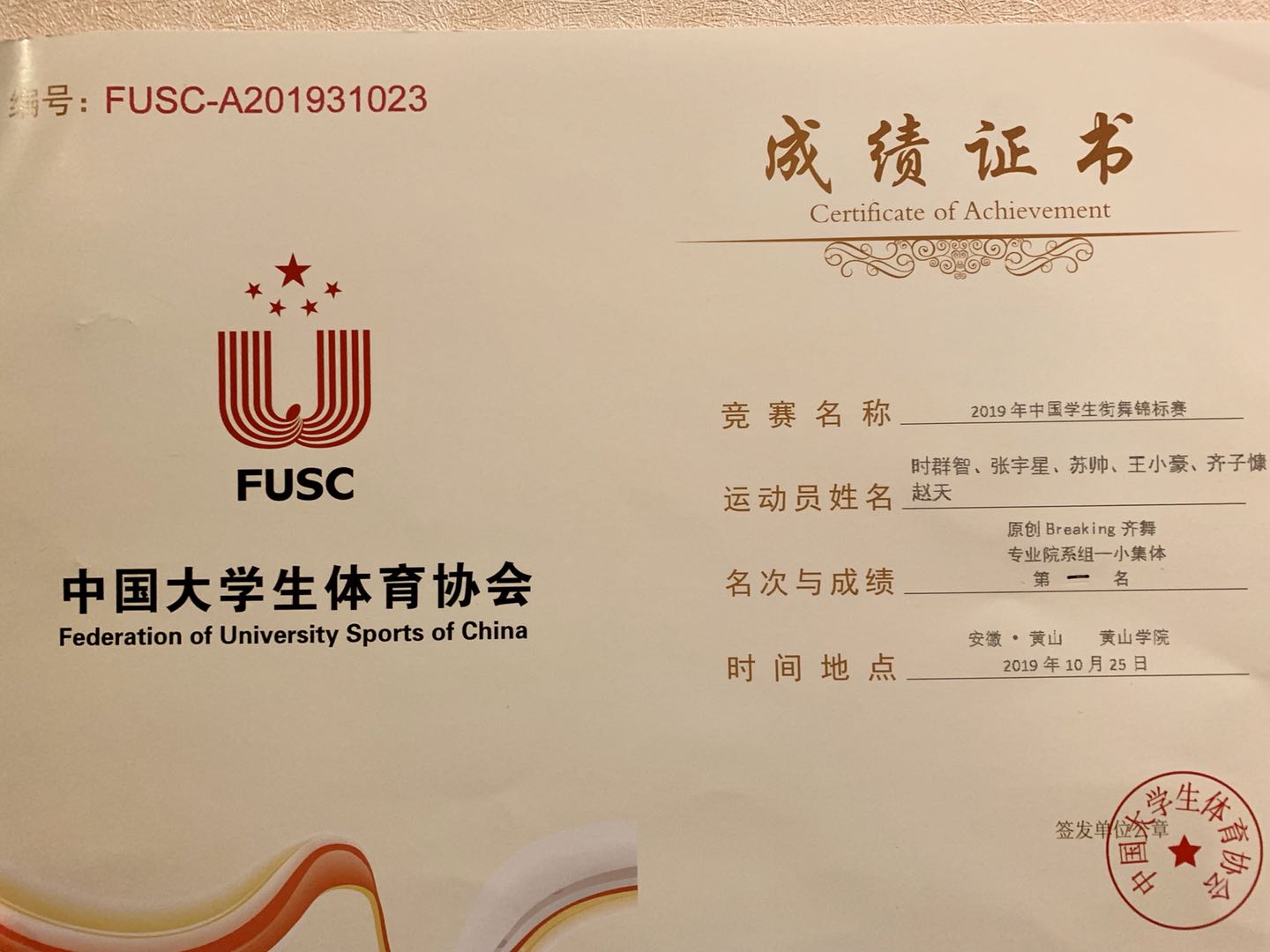10月28日晚,2019年中国学生街舞锦标赛闭幕式暨颁奖晚会在黄山学院体育馆隆重举行,圆满落幕。在此次大赛中,今年会官网李文强带领我院17名学生齐心协力、争创佳绩,喜获原创齐舞冠军、Breaking齐舞冠军、我院17级时群致获得1V1Breakingbattle冠军、4V4亚军。除此之外本次比赛李文强教师获得优秀教练员奖,队员时群致获得最佳人气奖,团体最佳创意奖、最佳编舞奖、最佳表演奖。张敏老师承担本次比赛裁判工作。