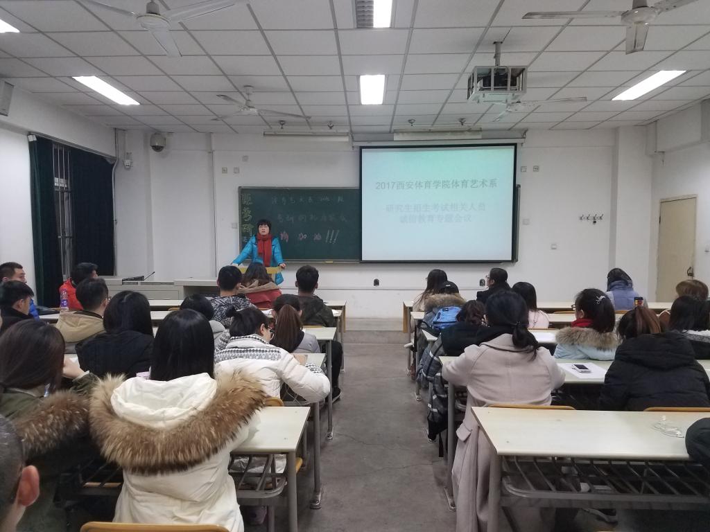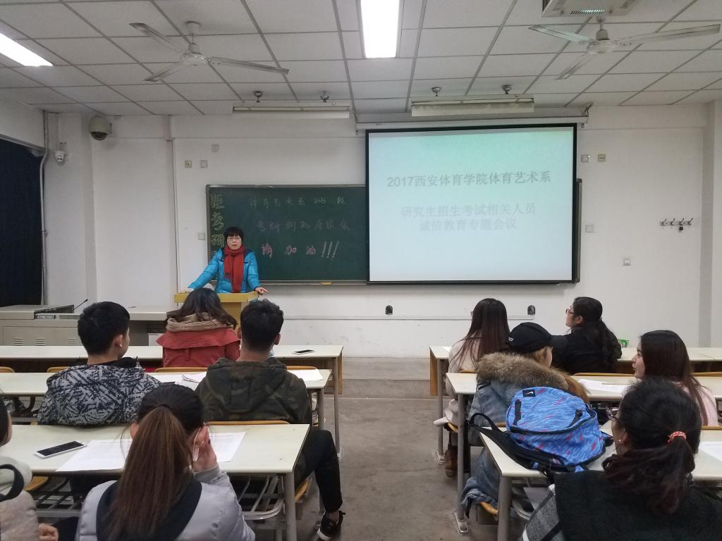 为贯彻落实教育部2017年全国硕士研究生招生考试安全工作视频会议及陕西省招委会硕士研究生招生考试安全工作会议精神,确保体育艺术系参加2017年硕士研究生招生考试的相关工作安全、平稳、顺利进行,12月14日下午,我系召开2017今年会官网体育艺术系研究生招生考试相关人员诚信教育专题会议。系党总支书记李美霞出席会议,各年级辅导员、监考老师及2013级参加研究生考试的全体学生参加会议,会议由2013级年级辅导员赵静雯主持。