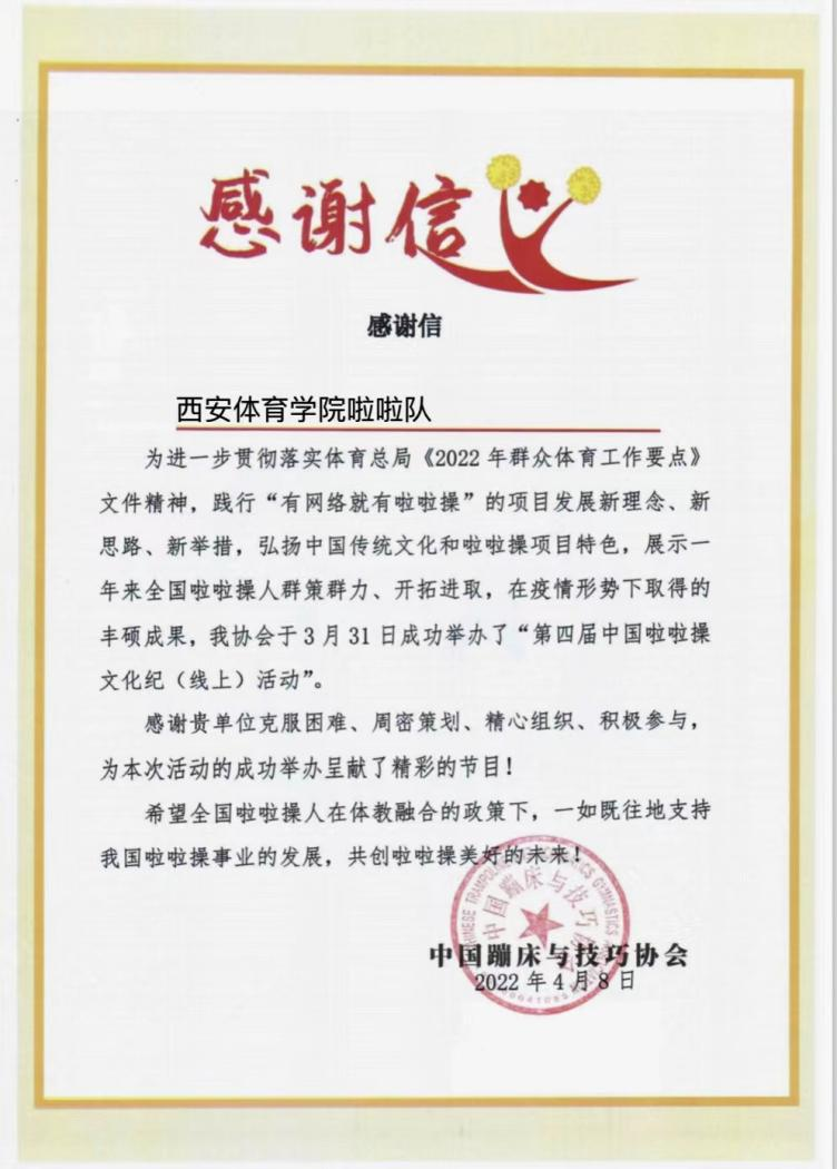 近日,今年会啦啦队收到中国蹦床与技巧协会发来的感谢信。信中对今年会啦啦队在本次由国家体育总局体操运动管理中心、中国蹦床与技巧协会主办,中国蹦床与技巧协会啦啦操分会承办的“第四届中国啦啦操文化纪(线上)活动”中的精彩节目给予肯定,并对今年会啦啦队克服困难、积极参与本次活动表示感谢。