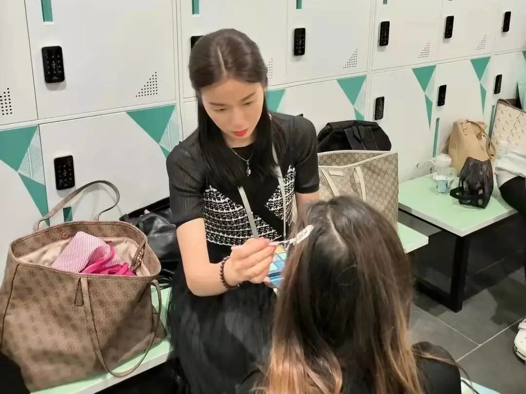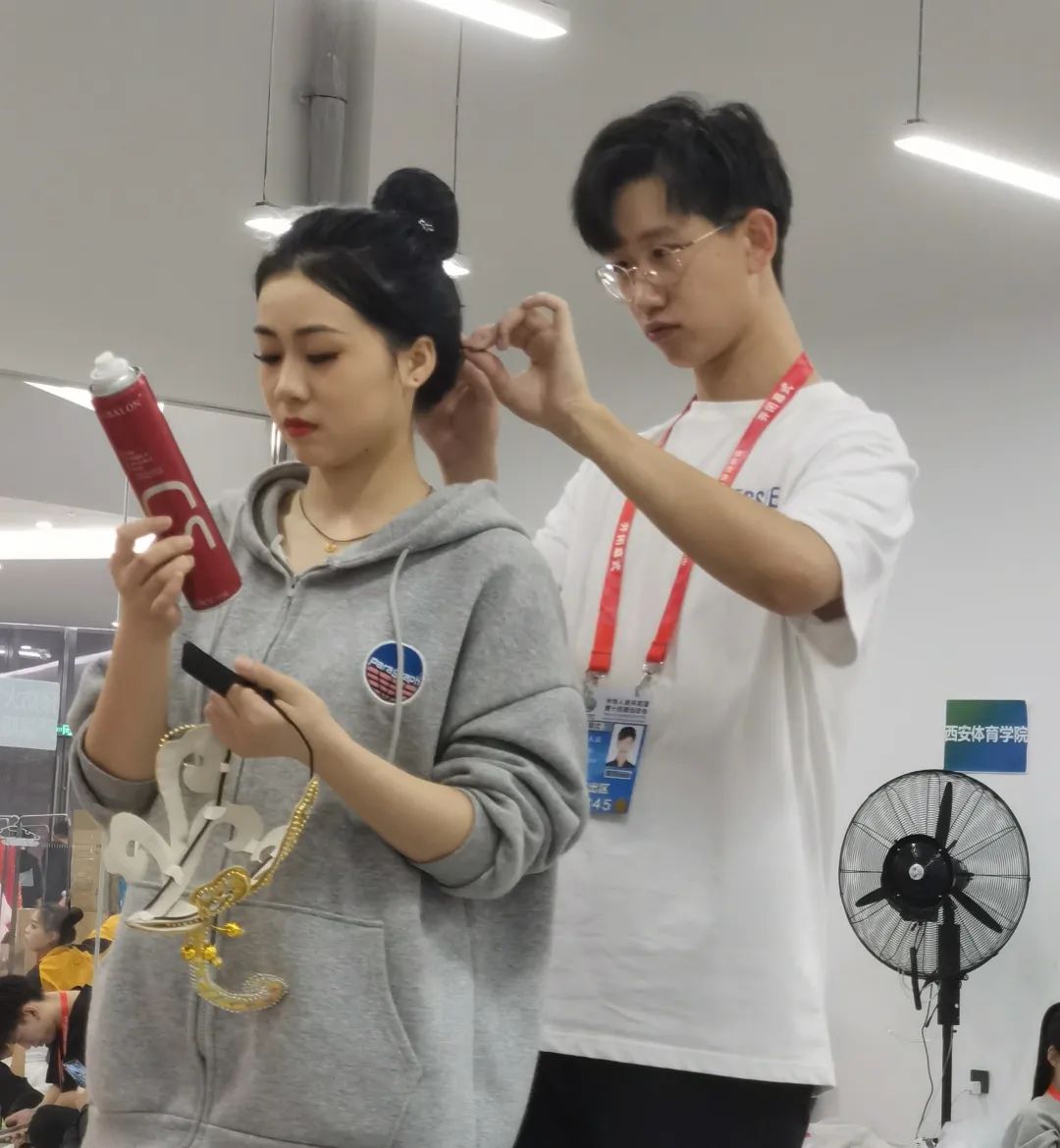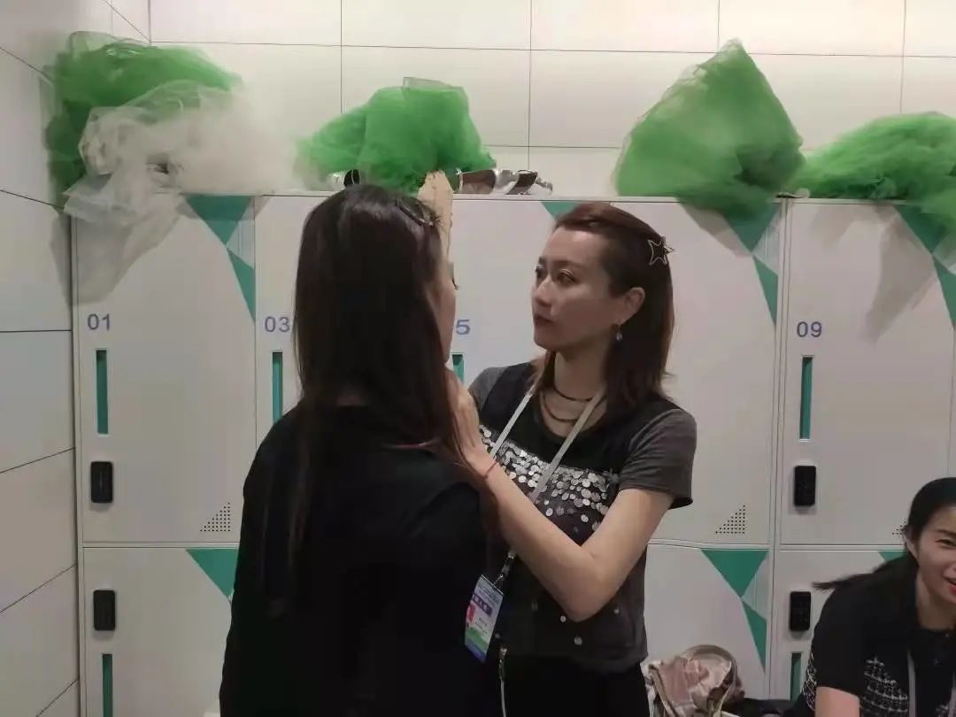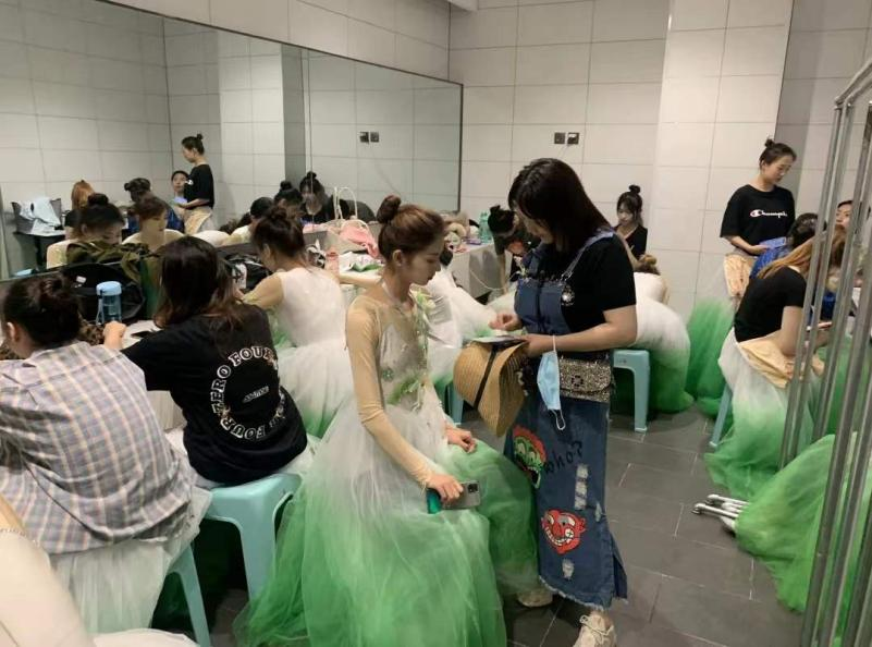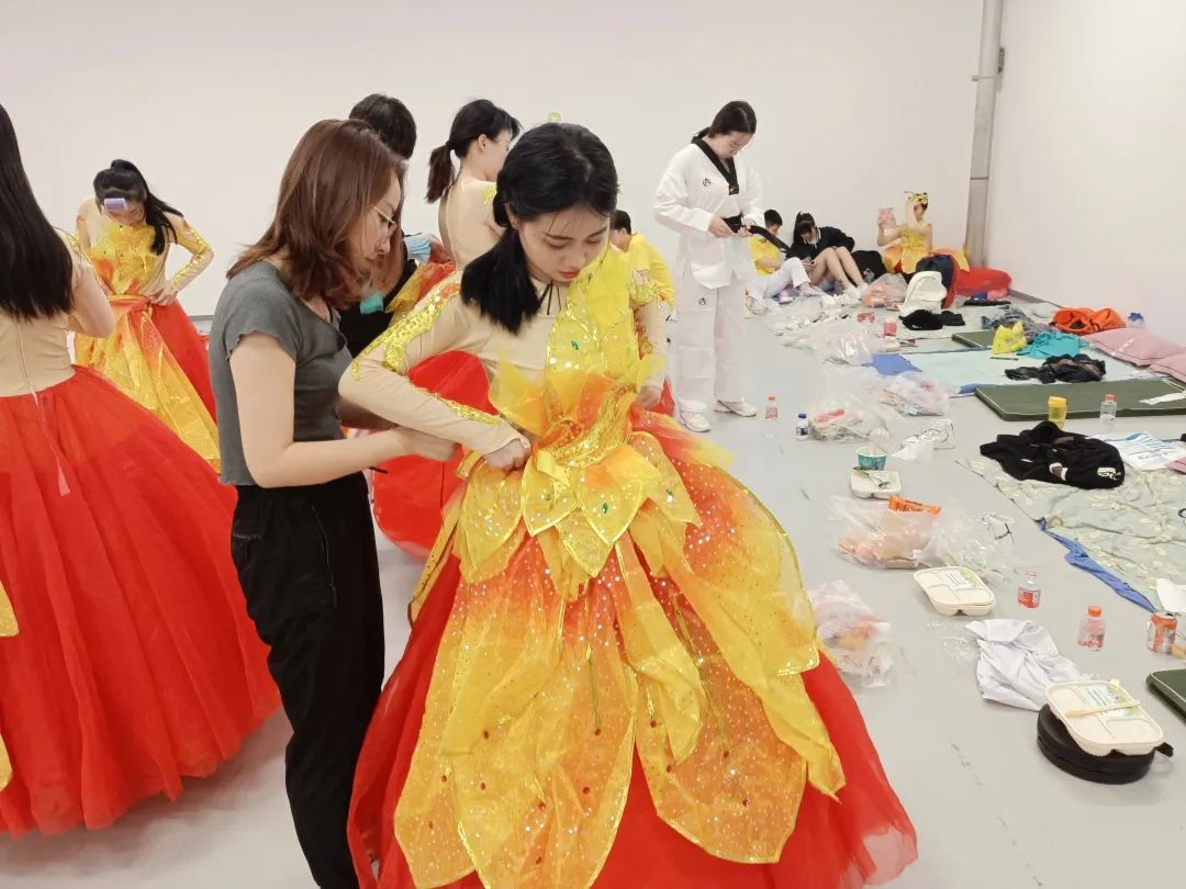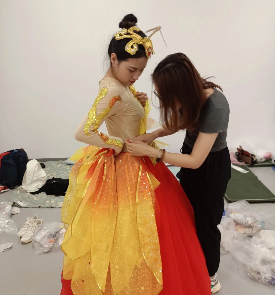 每次舞蹈演员上台表演前,带队教师都会认真为演员检查服装、整理妆发,为演出的精彩亮相添保障。
