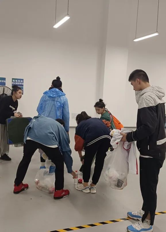 同学们自觉清扫休息区,离开时不留下一片垃圾