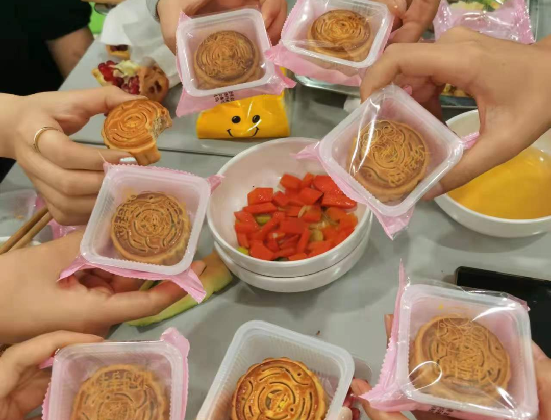 9月21日中秋节这天,省领导来到西铁院食堂前广场进行中秋慰问联欢活动,在活动结束后带队老师赵静雯和车栋在食堂里,也像家人们一样,与艺术学院的孩子们一起过中秋,吃月饼,并祝大家中秋节快乐。