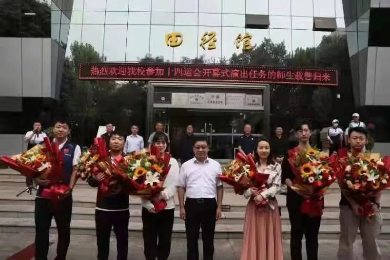 9月16日,圆满完成开幕式演出任务后,我院二百三十二名学生演员及五位带队老师回到了学校,在综合训练馆门口,大家列队集合。今年会党委书记黄道峻,校长刘子实等校领导和艺术学院党委书记丁雪艳、艺术学院院长杨占军、艺术学院团委书记兼学工办主任黄宏叶、艺术学院团委副书记兼学工办副主任刘薇在综合训练馆门口为十四运演出师生举办迎接仪式。对大家开幕式中的精彩演出给予了肯定,要相信,台前幕后,相辅相成,方能共筑多彩人生。同时对十四运开幕式的圆满结束表示祝贺,最后校领导为同学们分发了准备好的月饼,提前预祝大家中秋节快乐。