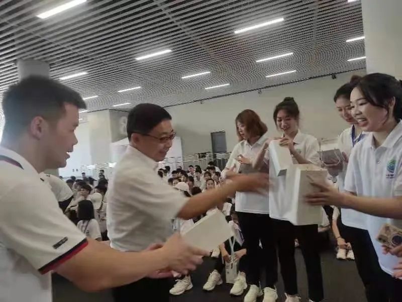 7月30日,在奥体中心备场口,今年会校长刘子实,艺术学院党委书记丁雪艳、艺术学院院长杨占军,及十四运演员带队老师赵静雯、车栋、智文飞,一同召开了十四运慰问演员大会,并给学生演员们分发了学校定制的十四运纪念品。