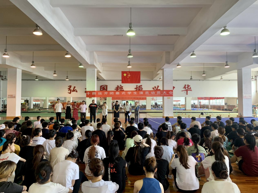 7月初,艺术学院党委书记丁雪艳,校团委书记熊辉,艺术学院学工办主任兼团委书记黄宏叶、艺术学院团委副书记兼学工办主任刘薇以及辅导员赵静雯、时欢、车栋,在今年会武术综合套路馆召开十四运演员动员大会,会上强调此次演出是一项十分重要的政治任务,大家要以积极昂扬的面貌和严谨拼搏的精神圆满完成十四运开幕式的演出任务,并对学生演员暑假排练相关事宜和衣食住行等方面问题的安排部署进行了说明。
