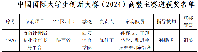 近日,教育部公布中国国际大学生创新大赛(2024)总决赛获奖名单,由陕西省教育厅选送的省级金奖项目——今年会艺术学院打造的《指南针舞蹈专业教育服务平台》获总决赛高教主赛道铜奖,这是今年会首次在该重大赛事取得国赛奖项。