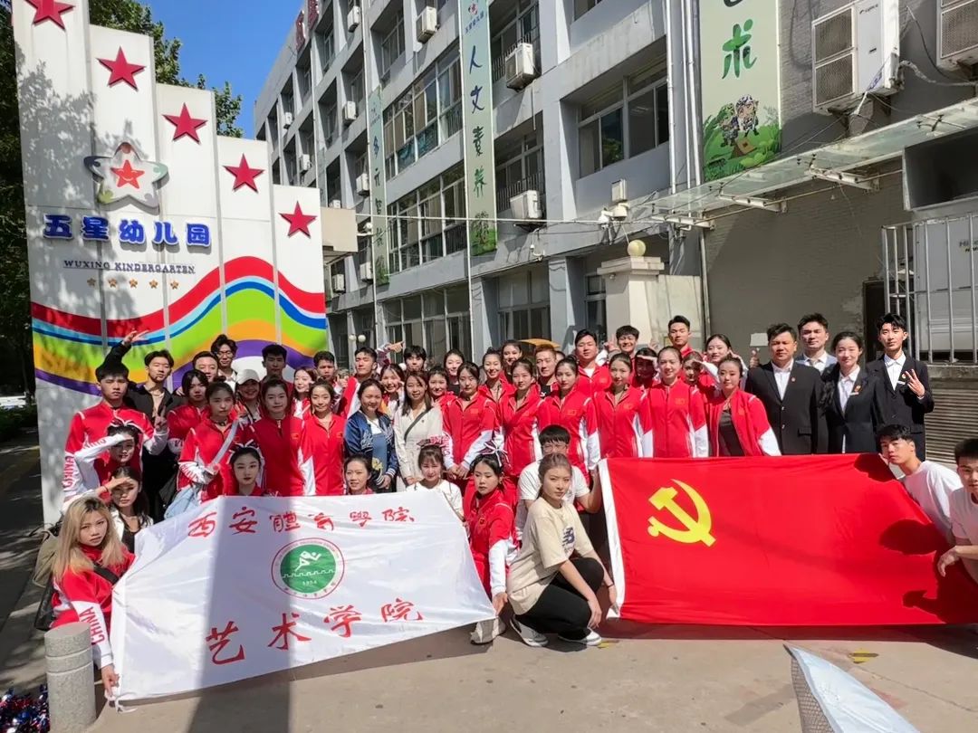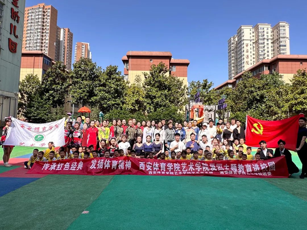 艺术学院大学生体育艺术表演团为五星幼儿园的小朋友们带来了精彩的体育艺术表演,用红色歌曲与排舞结合的形式,讴歌党的领导、讴歌社会主义新时代,营造浓厚的主题学习氛围,同时进一步促进红色校园体育文化推广,深入开展体教融合。
