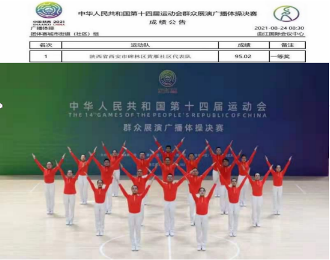 2021 年 8 月 20 日至 8 月 31 日,第十四届全运会群众赛事活动展演项目线 下评审活动在西安曲江国际会议中心举行。舞蹈教研室娄山副教授、唐甜甜老师、 周思思老师、王格菡老师等代表的陕西省西安市碑林区黄雁社区队荣获团体赛城 市街道组一等奖; 同时,还获得了网络评选最佳人气奖。