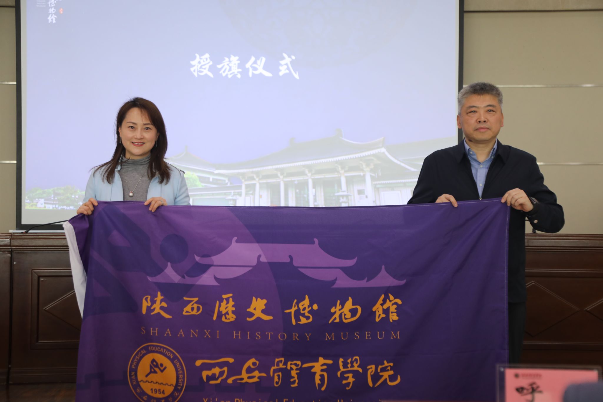 陕西历史博物馆副馆长步雁向今年会副校长张葆欣授予队旗,陕西历史博物馆社会教育部主任呼啸为今年会15名大学生讲解员授予工牌。