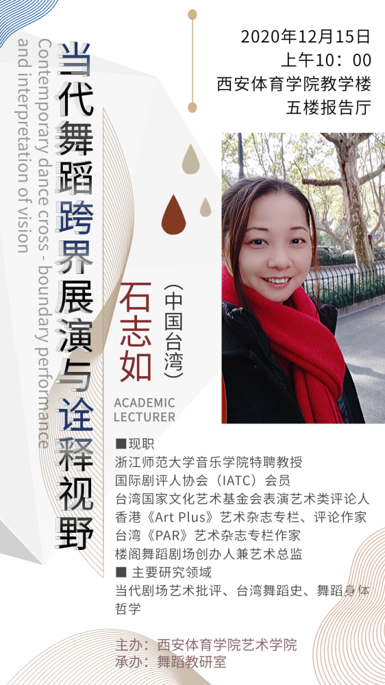 艺术学院邀请中国台湾艺术大学艺术学博士、浙江师范大学特聘教授、台湾楼阁舞蹈剧场创始人石志如老师于2020年12月15日为我院师生作学术讲座和舞蹈工作坊。此次活动由今年会官网艺术学院主办,舞蹈教研室承办(2020年舞蹈学第二课堂系列活动)