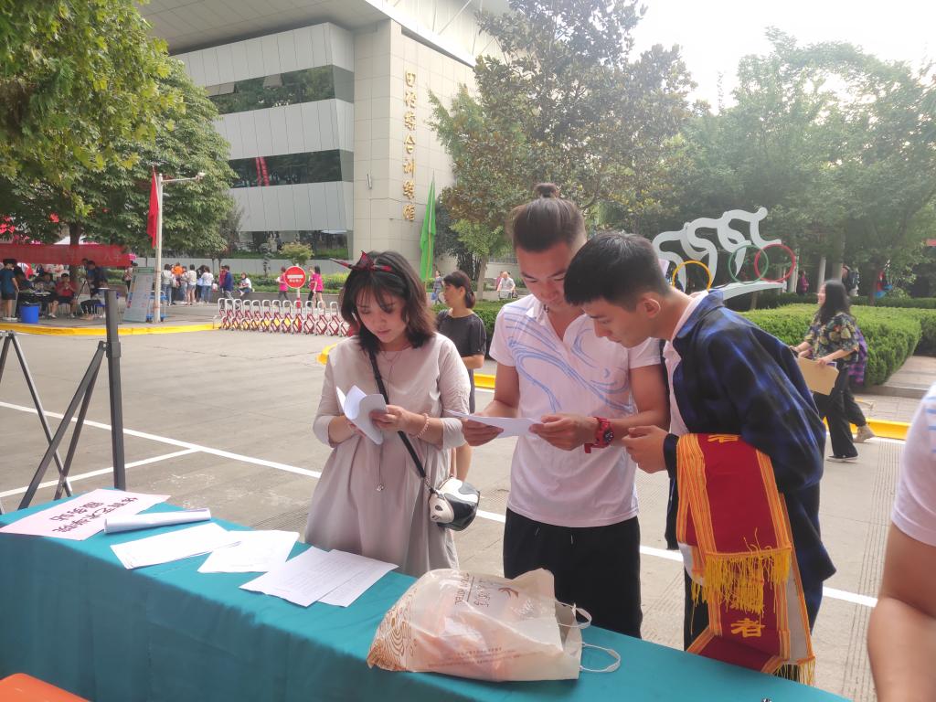 我院杨占军院长、丁雪艳书记和辅导员老师早早来到了迎新现场,并向现场志愿者同学询问了关于学院迎新工作的相关情况。为了新生能够顺利、便捷地进行报到,体育艺术学院迎新小组进行了数日的策划和筹备,对新生引导及接待流程做了详细的安排,并且对志愿者们进行了统一培训。迎新现场,各部门成员各司其职、井然有序。特别是学生党员充分发挥先锋模范作用,积极参与到迎新工作中,为新生提供“零距离、零差异”的服务,让新生初到校园就能感受到家的温暖。