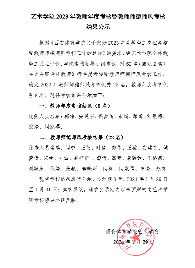 艺术学院2023年教师年度考核暨师德师风考核结果公示