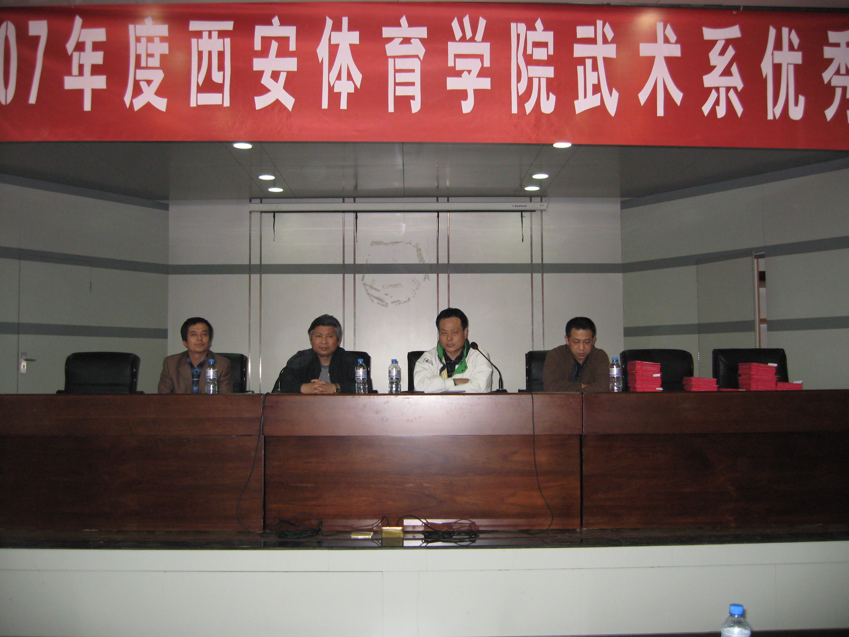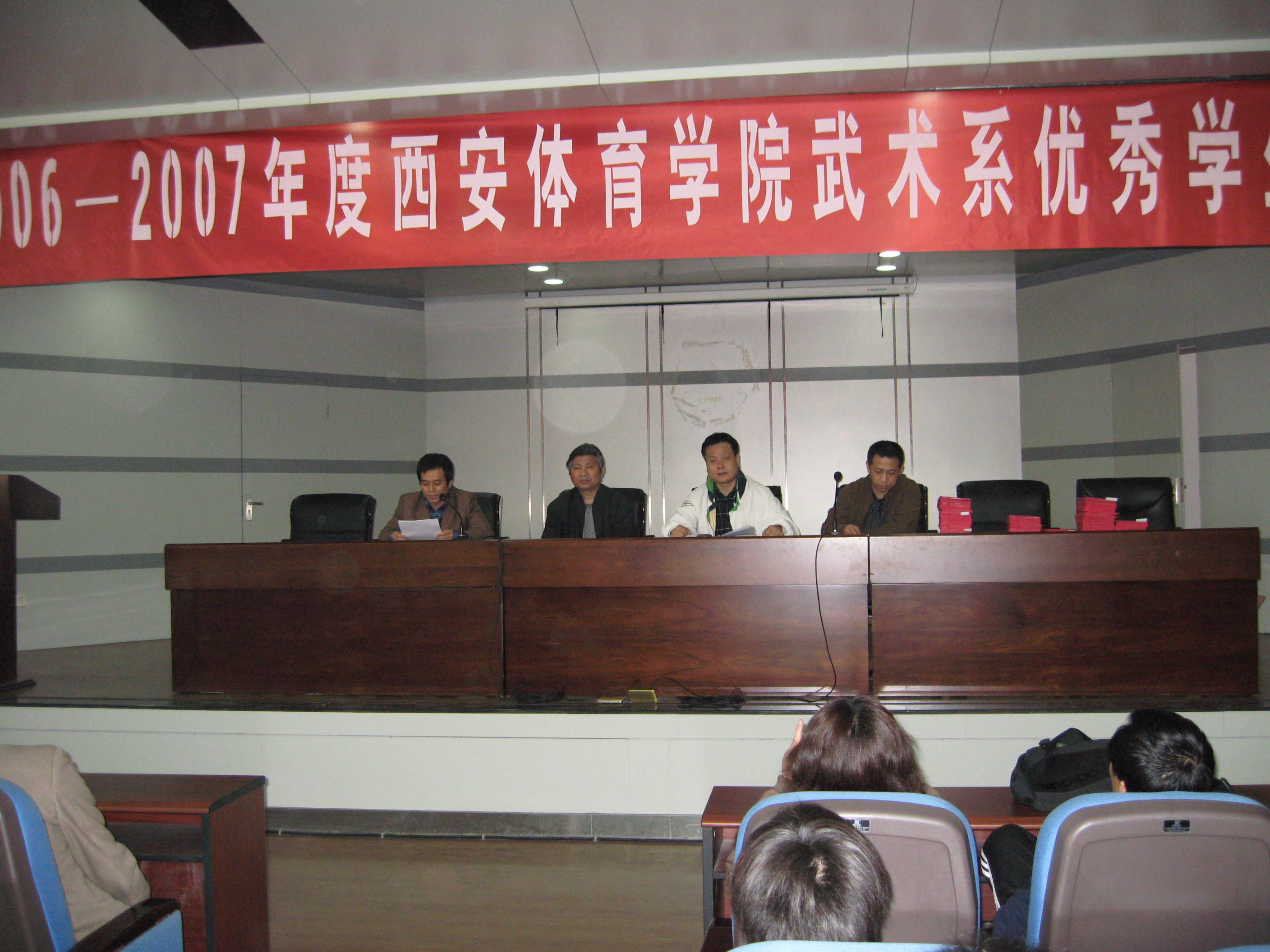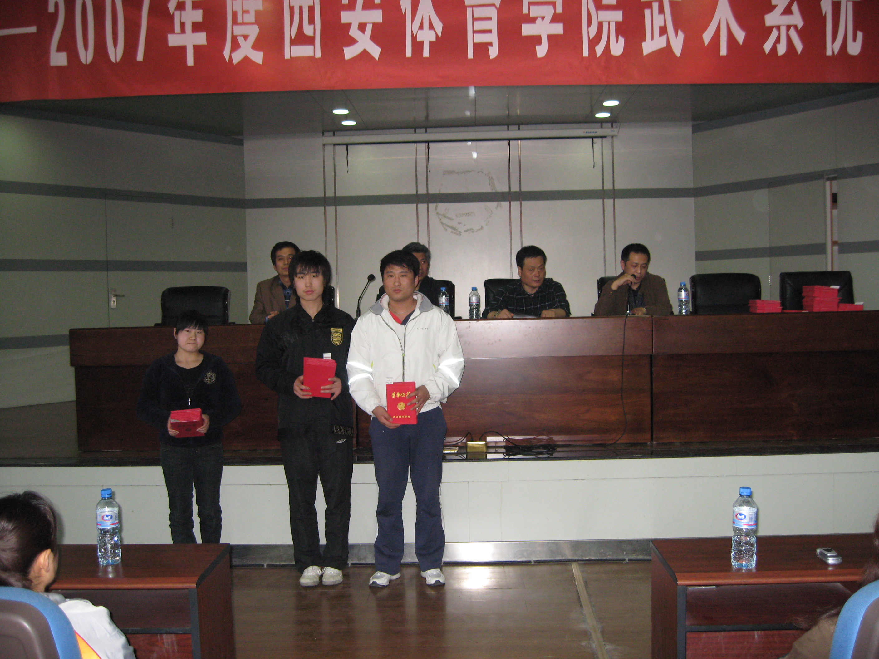 武术系主任陈亚斌教授、总支书记雷甲谋、教学副主任马文国博士、系办公室主任、系教学秘书、年级辅导员及各教研室主任和支部书记参加了表彰大会。会议由系办主任主持,首先由马文国副主任宣布了被表彰学生的名单,随后由陈亚斌主任和雷甲谋书记讲话。他们对被表彰的同学给予了肯定和鼓励,同时也对全系师生在过去一年中的工作和学习做了充分的肯定,并免励大家在新的一学年中再接再厉,争取取得优异的成绩,为武术系的发展尽一份力。