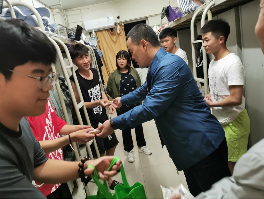 9月13日是我国传统节日-中秋节,也是阖家团圆的时候。武术学院党总支书记朱舰、副院长袁金宝在年级主任王华的陪同下,来到学生6号、2号公寓看望因为军训无法和家人团聚的2019级新生,给来自五湖四海的纤纤学子送来了月饼及节日的问候!