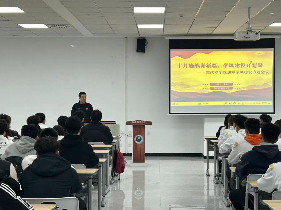 学风是读书之风,是治学之风,更是做人之风。建设优良学风是武术学院进一步发展的根基,是学院教学和管理工作的灵魂,更是持续深入推进武术学院“十月鏖战”目标的关键一步。他要求武术学院全体学生要扎实筑牢“一个整体”思想,从上好每一节课、做好每一个训练动作、坚守“武德武风”抱拳礼仪做起,奋发展现武术学院学子良好的精神风貌。