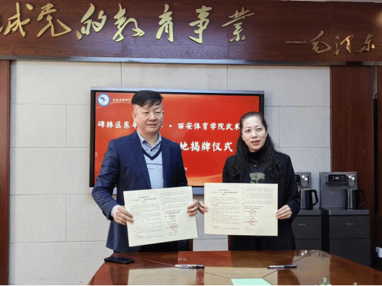 武术学院副院长李正恩(左一)与碑林区东羊市小学校长王肖(右一)签署教学实习基地协议书