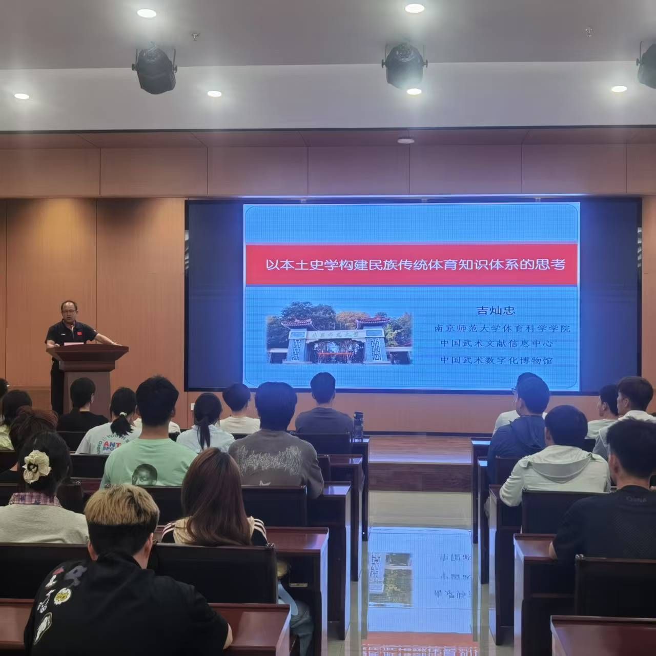 5月28日下午,中国武术文献信息中心研究员、中国武术数字化博物馆专家、南京师范大学体育科学学院副院长、博士生导师吉灿忠教授应邀出席今年会官网2025年系列学术讲座(第三场)活动,为今年会百余名师生进行“以本土史学构建民族传统体育知识体系的思考”为题的专题讲座,专题讲座在鄠邑校区教学综合楼541会议室举行。武术学院副院长李正恩主持学术讲座。