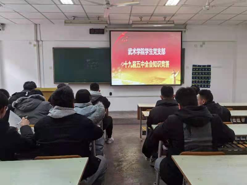 为进一步贯彻落实党的十九届五中全会和习近平总书记系列重要讲话精神,帮助武术学院学生党支部更加深入地学懂、弄通党的十九届五中全会具体内容。 2020年12月7日,武术学院学生党支部在新教学楼开展党的十九届五中全会知识竞赛。通过此次竞赛,充分检验了武术学院学生党支部的阶段性学习成果,有效提升理论知识水平,加深了对党的十九届五中全会精神的理解。