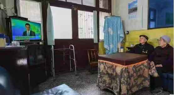 张富清和老伴在两居室家中收看新闻(新华社程敏  摄)