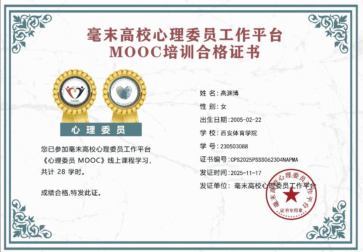 此次心理委员Mooc培训课程系统讲解了大学生常见心理困扰、沟通技巧与危机干预常识,让我掌握了倾听、共情的核心方法,让我更懂得如何用温和真诚的语言传递关怀,作为一名播音艺术专业的学生,我将充分会结合自身专业所长,主动关注身边同学,用恰当的表达化解他们的焦虑,协助老师搭建心理健康防护网。此次培训让我深知,心理委员既是责任担当,更是心灵桥梁,我将持续提升自身能力,为和谐校园添砖加瓦。