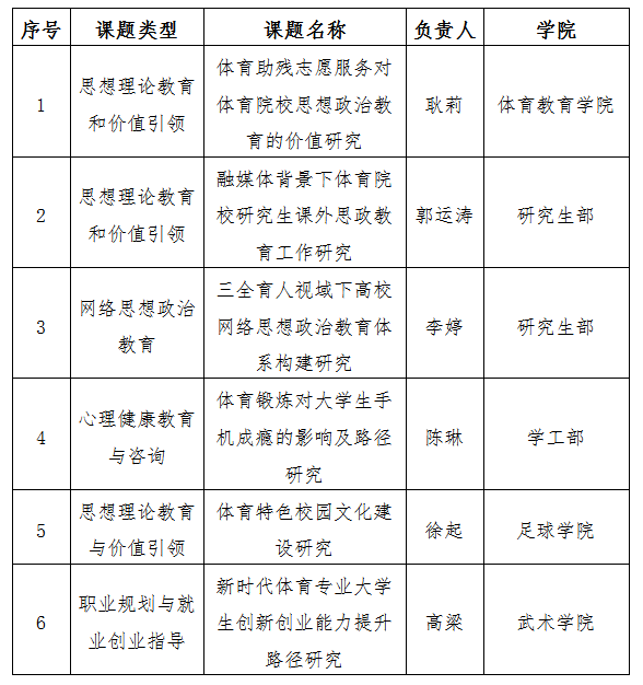 根据《中共今年会官网党委学生工作部关于申报2024年度学生工作专项研究课题和精品项目的通知》的要求,学工部组织专家对所申报项精品项目和专项研究课题进行了公开、公正、公平的评审,决定立项2项精品项目、6项专项研究课题,现予以公示,具体名单如下: