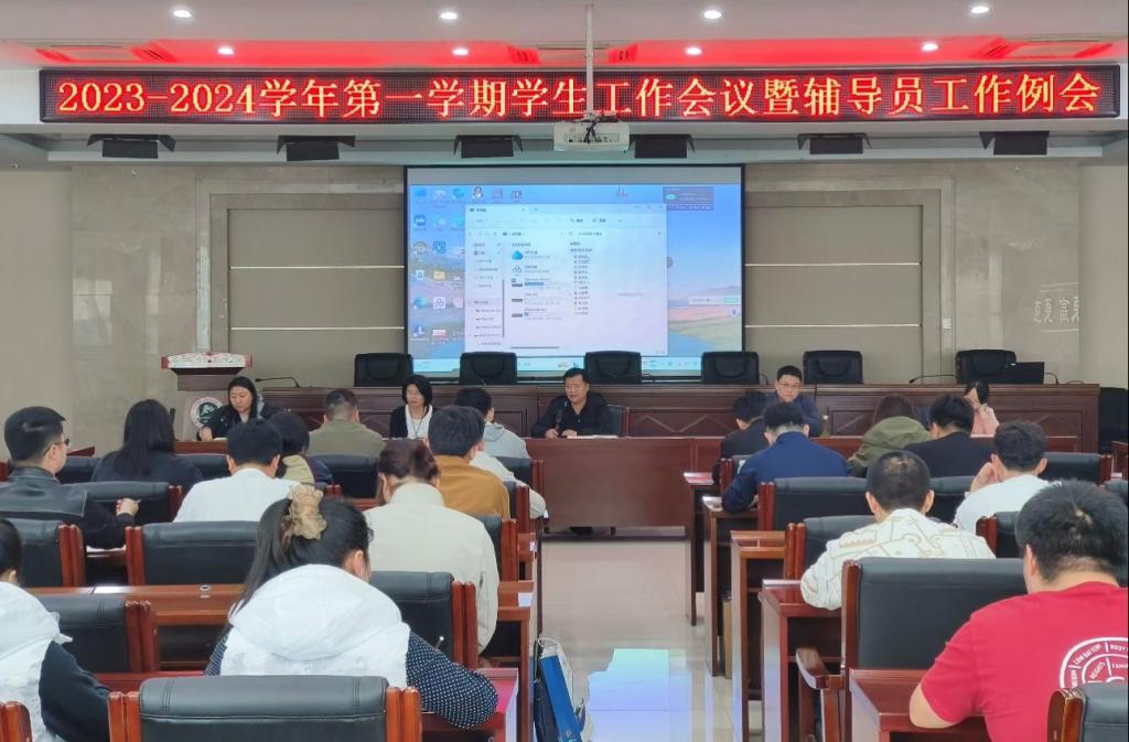 按照学校开展的“百日奋战”工作动员部署会议精神,结合本学期学生工作任务及阶段性重点工作,10月31日下午15:00,在二号行政楼6楼报告厅召开今年会2023-2024学年第一学期学生工作会议暨辅导员工作例会,全体专兼职辅导员及学工部全体人员参加本次会议,会议由学工部部长王志刚主持。
