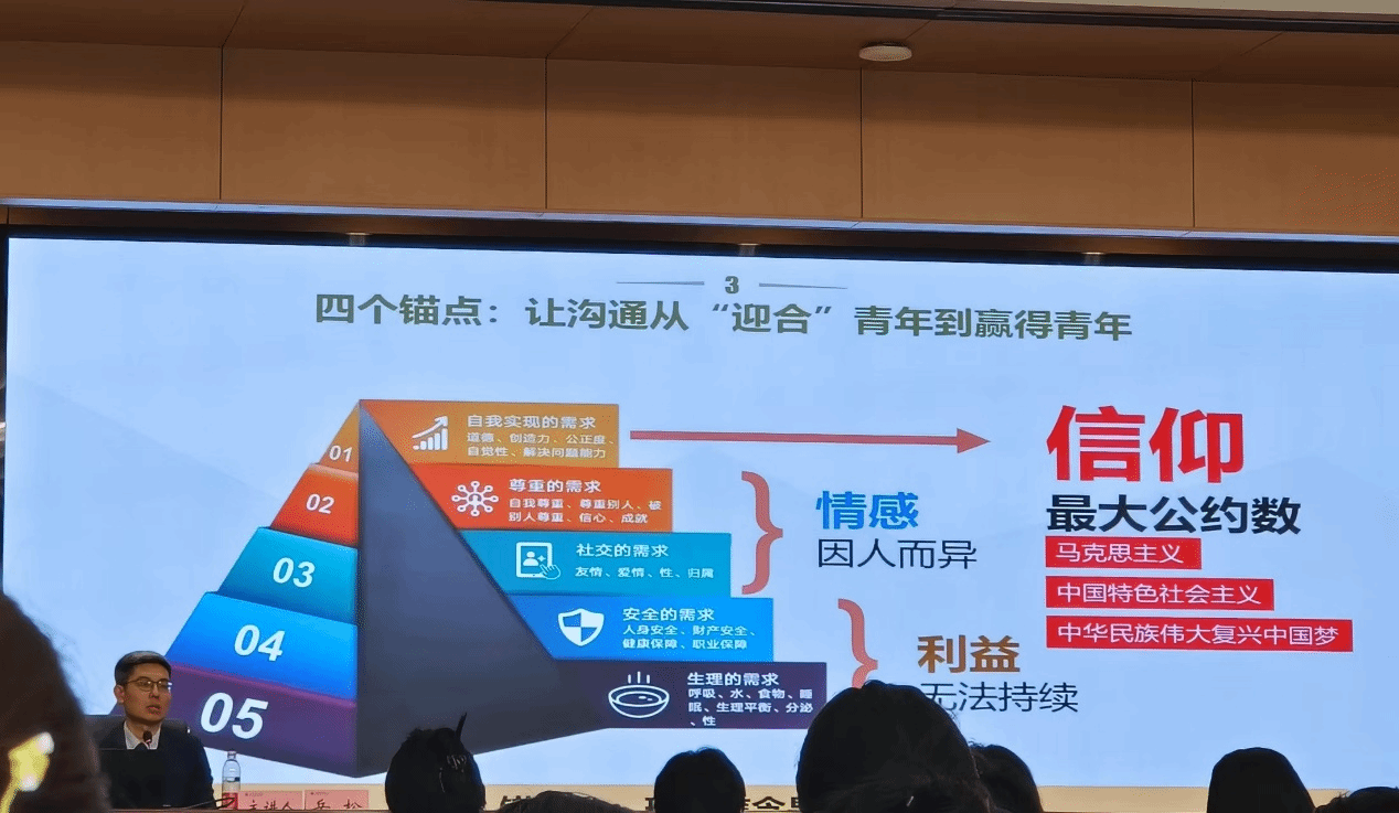 在授课过程中,岳松教授结合生动的典型案例,精准描绘了当代中国青年的身心特质,并提出了“四个锚点”的沟通策略。他强调,要让沟通从“迎合”青年转变为“赢得”青年,辅导员需把握信仰的“最大公约数”——即马克思主义、中国特色社会主义和中华民族伟大复兴的中国梦,通过翻译沟通时代情绪来阐述时代精神,从而引发学生的共鸣,真正赢得青年的心。