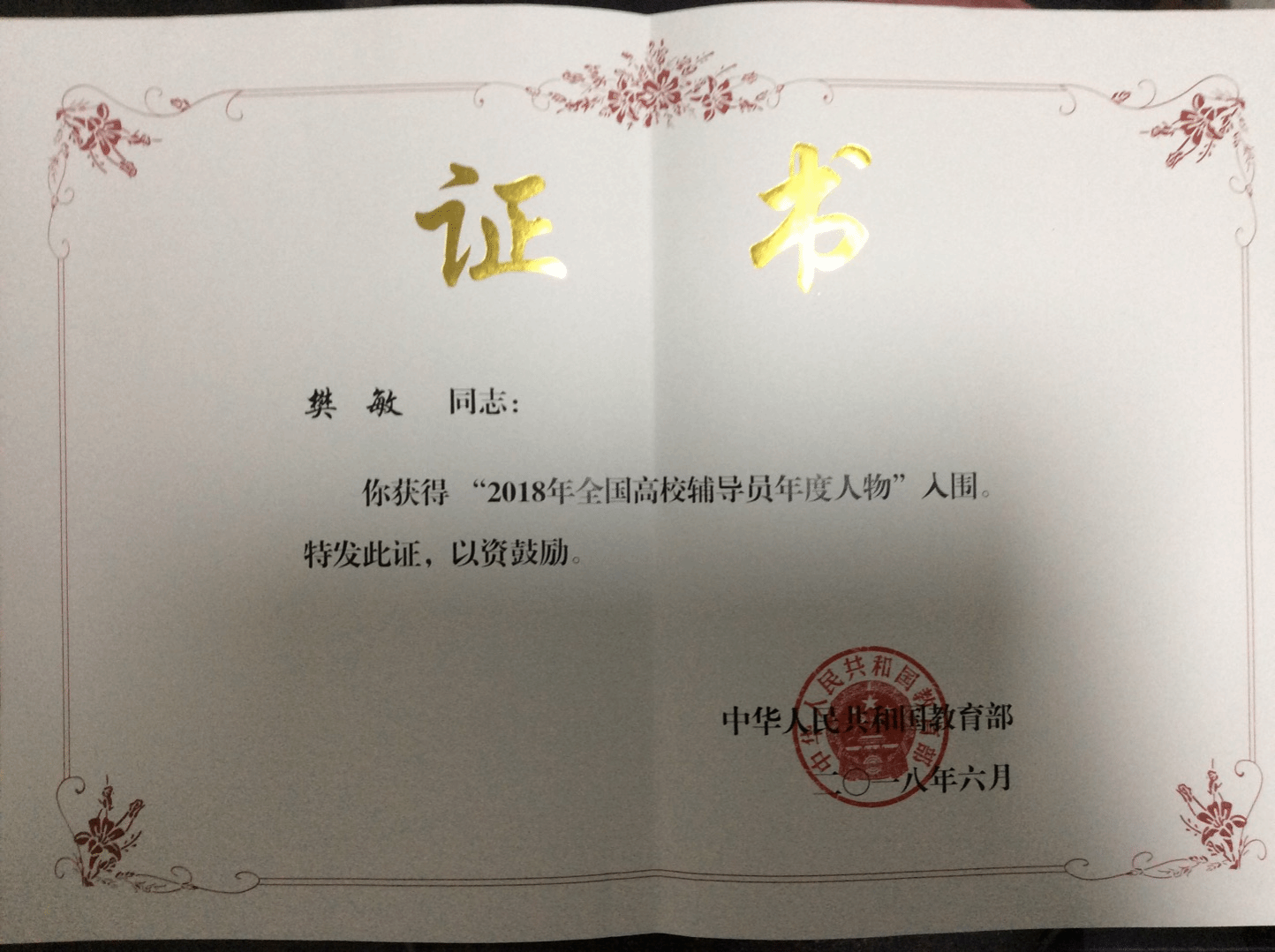 一、国字号荣誉:樊敏老师荣获“全国高校辅导员年度人物”入围奖