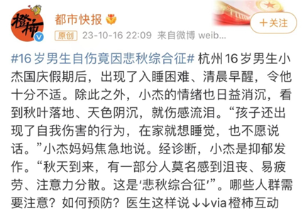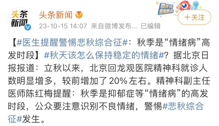 虽然我们身处中原地区,在秋冬季依旧能感受到日照,但太阳晚升早落,日照时长确有减少,也有可能引起“悲秋”情绪。