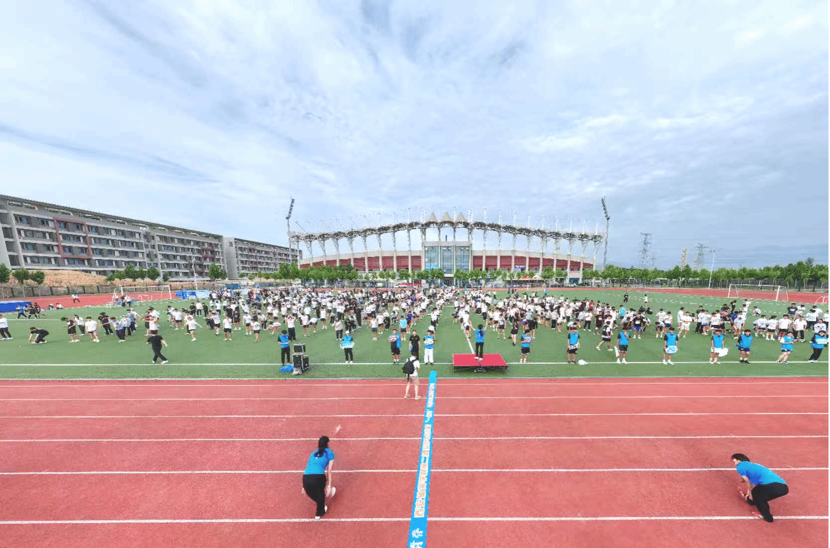 开跑仪式上,随着动感音乐响起,啦啦操队率先登场,现场氛围即刻“升温”。健美操运动员带领全体师生活力热身,激情满满。随后,党委副书记马海涛与副校长毕德鹏鸣笛发令,本次活动正式拉开帷幕!