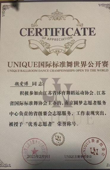 通过魏爱博的努力,儿童家长的接待工作井然有序,后台秩序得到有效维护,为活动的顺利进行提供了有力支持。本次实践使魏爱博的沟通能力、组织能力和应变能力得到了显著提升,学会了如何在高压力环境下高效工作,并与团队成员紧密配合。魏爱博的认真负责和出色表现得到了南京圆梦志愿服务中心的高度评价,被授予“优秀志愿者”称号。