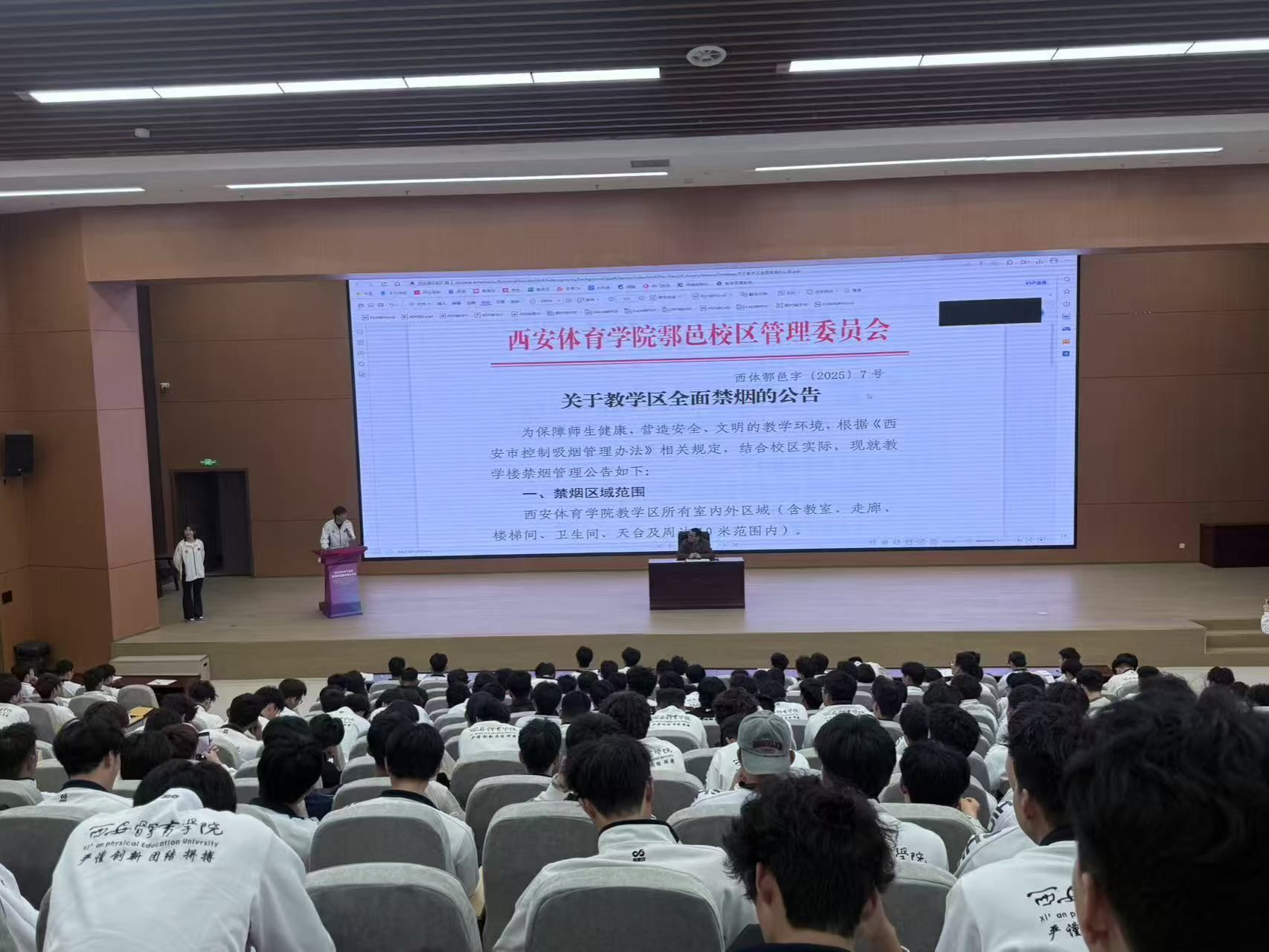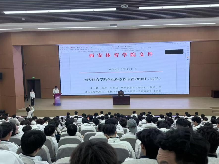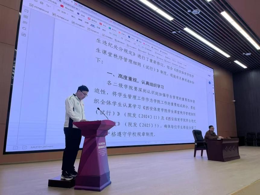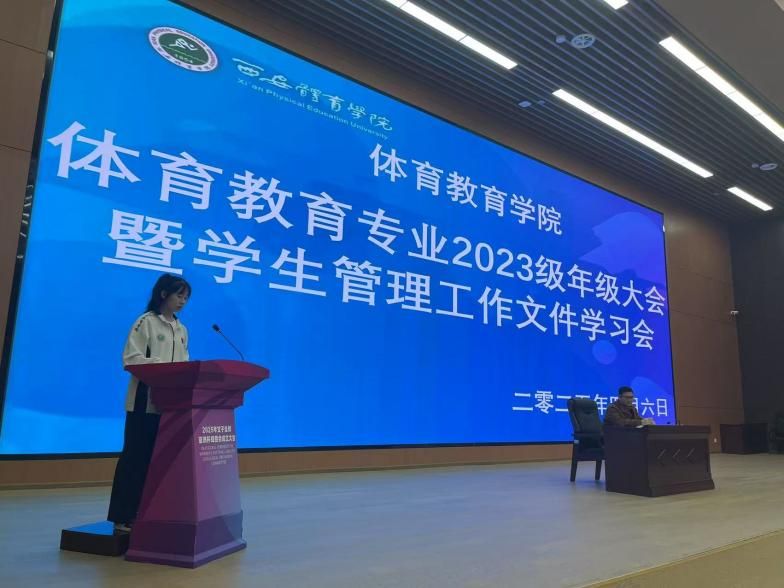 为进一步加强学生管理,推动学风建设,营造风清气正的校园环境,为学生的成长成才提供坚实保障,促进学生全面发展。体育教育专业2023级于4月6日21:00在图书馆三楼报告厅召开年级大会暨学生管理工作文件学习会。会议由年级办公室主任李馨主持,全体2023级学生参会。会议聚焦制度学习、文件解读、主题发言、榜样引领与责任践行等重点开展,贯彻“四季决战”精神为年级发展注入奋进力量。