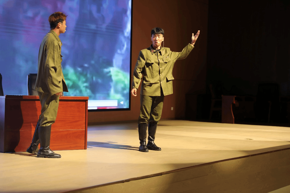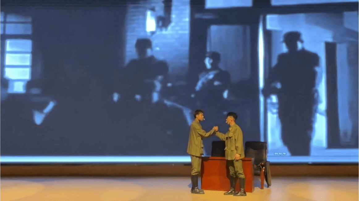 当张学良、杨虎城与蒋介石对峙的高潮部分,体育教育学院2023级和2024级的演员们的表演极具感染力。饰演张学良的同学将其内心的矛盾、挣扎与坚定的抗日决心展现得入木三分;杨虎城的沉稳果敢也被诠释得十分到位。而蒋介石的惊慌失措与固执,在演员的演绎下也让人印象深刻。