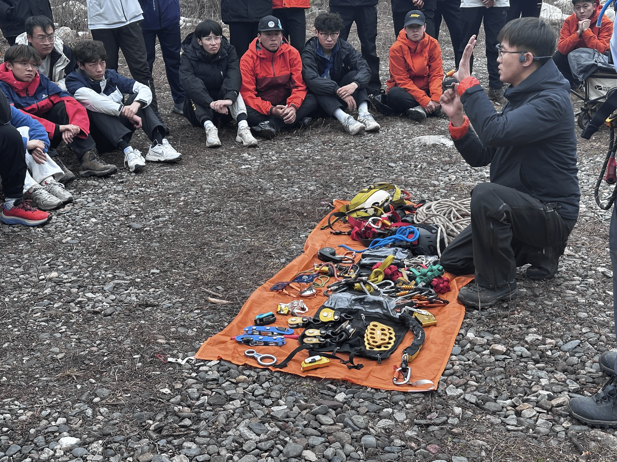 在启程的路途之前,老师也为我们请到了蓝天救援队副队长望月来给同学们讲解户外的技能与基础知识。首先,了解了救援绳索和锁扣的使用方法;其次,学习了绳索的缠绕和固定,并实践操作单边八字绕环;最后,同学们学习到了人在失温时产生的三个阶段的特征,且对友在失温时如何处理,以及迷路时的判断和方法。
