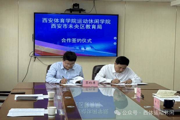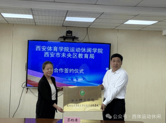 签约环节,双方代表郑重签署合作协议并签字盖章。随后的授牌环节,运动休闲学院向未央区教育局授牌,双方领导共同揭牌,标志着合作迈向新征程。